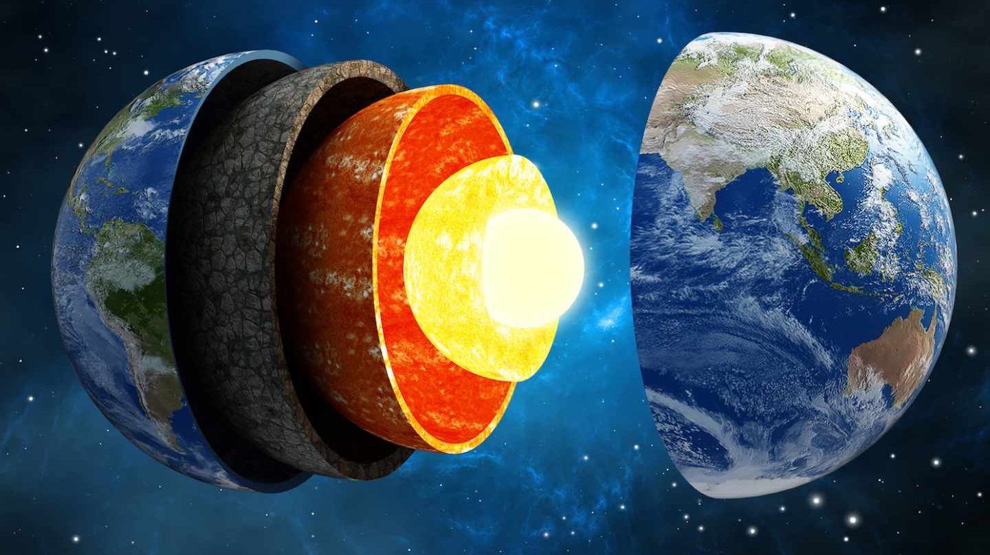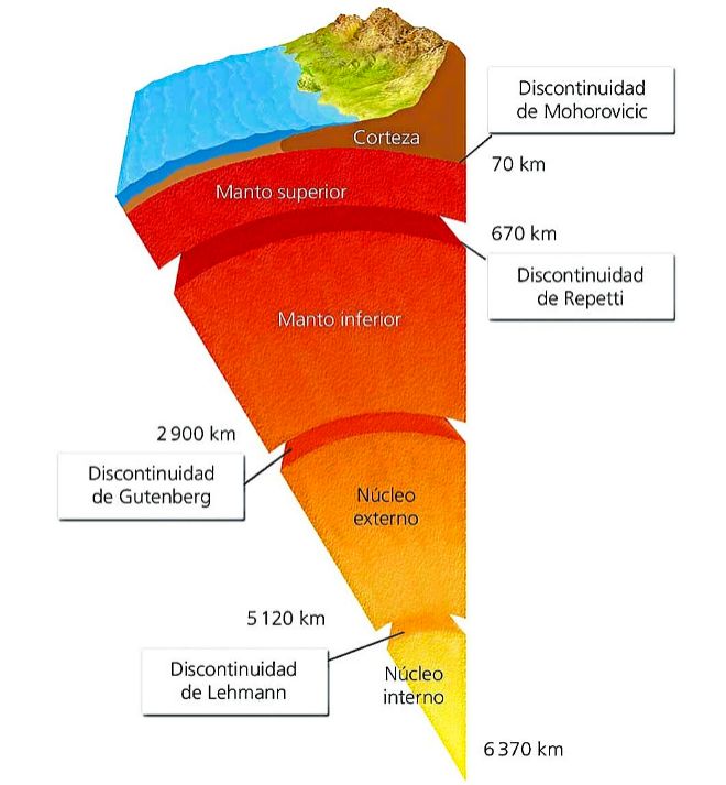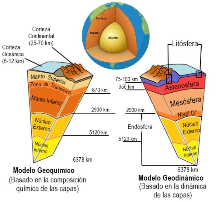 El interior de la Tierra, al igual que los otros planetas, está dividida en capas según su composición química o sus propiedades físicas, pero, a diferencia de los demás planetas terrestres, tiene un núcleo interno y un núcleo externo distintos. Su capa externa es una corteza de silicato sólido, químicamente diferenciado, bajo la cual se encuentra un manto sólido de alta viscosidad. La corteza está separada del manto por la discontinuidad de Mohorovičić, variando el espesor de la misma desde un promedio de 6 km en los océanos a entre 30 y 50 km en los continentes. A la corteza y la parte superior fría y rígida del manto superior se la conoce como litosfera, y es aquí donde se encuentran las placas tectónicas; debajo de la litosfera se encuentra la astenosfera, una capa de relativamente baja viscosidad sobre la que flota la litosfera. Dentro del manto, entre los 410 y 660 km bajo la superficie, se producen importantes cambios de estructura cristalina, los cuales generan una zona de transición que separa la parte superior e inferior del manto. Bajo el manto se encuentra un núcleo externo líquido de viscosidad extremadamente baja, descansando sobre un núcleo interno sólido el que puede girar con una velocidad angular ligeramente superior que el resto del planeta, avanzando de 0,1 a 0,5° por año.
